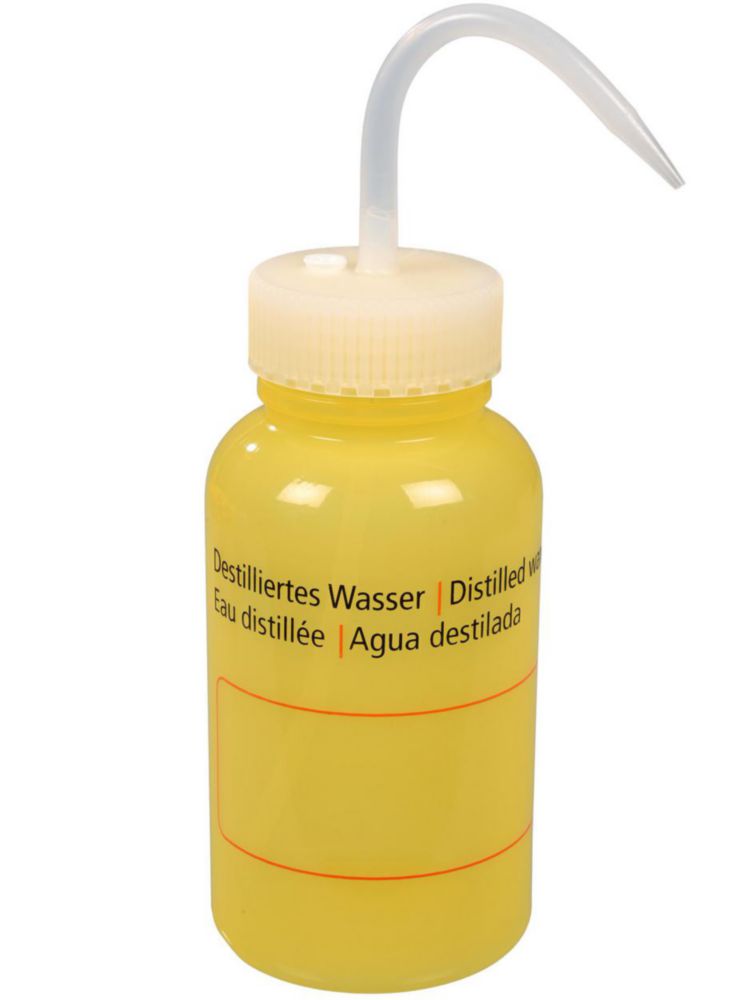 Bürkle LeakProof Wash Bottle 500 ml, LDPE, “Dest. Water” Printing in German, English, and French