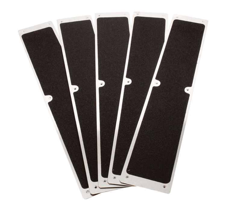 Reduce slips and increase safety on stairs with a highly visible stair tread. Helps protect stairs from wear and tear, whilst also increasing safety. Easy to install and replace. An aluminium plate with non-slip tape bonded to it to increase traction. Available in packs of five, or individually.